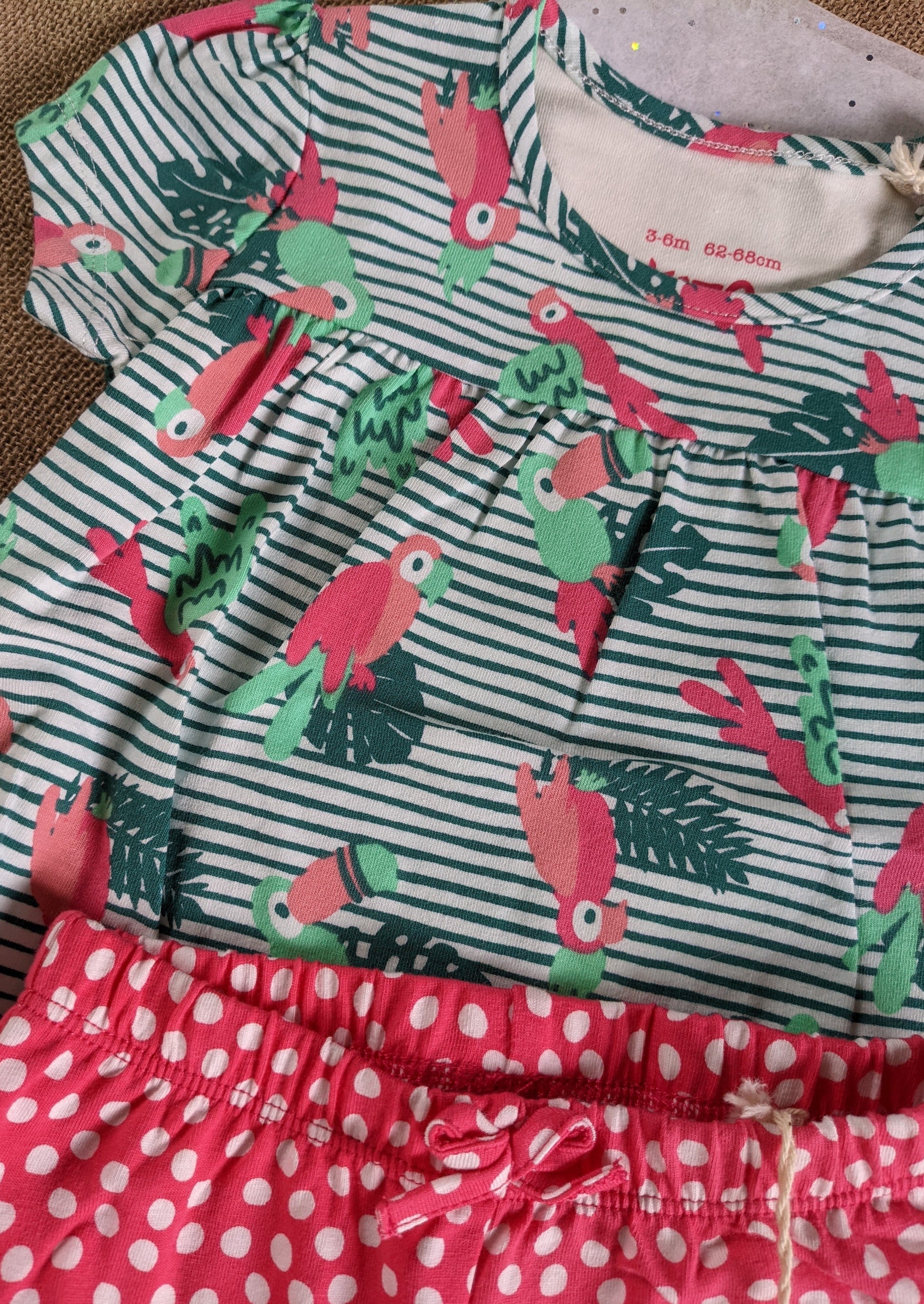 Summer is here when you think of parrots.  Coconut button should opening.  Tunic style with a Pretty Polly print featuring a pink parrots.  Bottoms are a polka dot design and match well with the tunic style top.
